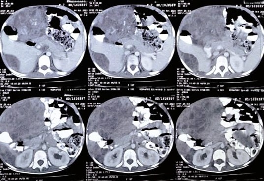 Figure 4: CECT whole abdomen (axial view), Postoperative (after few months of defaulter) showing huge intraabdominal SOL almost occupying whole abdomen.