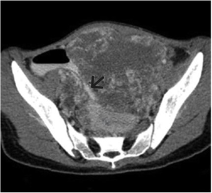 Figure 1: CECT scan of Pelvis (preoperative) showing a pelvic SOL compressing Bowel loops (arrow).