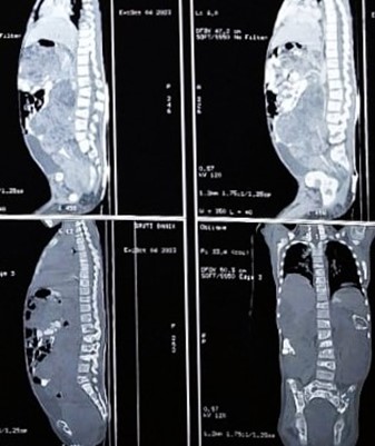 Then she again presented with huge abdominal distension and was unable to walk. She was again evaluated for the disease status. The Blood parameters, as on 01/08/2023, were: BetaHCG -> 96120 mIU/ml, CA-125 –> 207.5 U/ml, Sr LDH -> 4180 U/L, AFP –> more than 1000 ng/ml. CECT scan Thorax and Abdomen on 07.08.2023 showed, Large heterogenous enhancing SOL of 8.1 x 6.3 x 6.1 CM in POD, invading and incaving the ano-rectum region with bilateral pleural effusion.