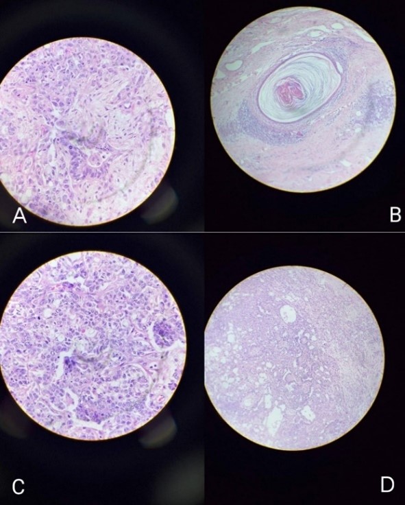 Figure 2: Histopathology of the tumour showing (A) Yolk sac, (B) Immature Teratoma, (C) Dysgerminoma and (D) Choriocarcinoma