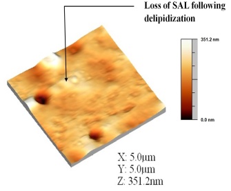 In the previous study, we established using a high-resolution imaging technique, atomic force microscopy (AFM), that a well-organized surface-active phospholipid covers the surface of the cartilage (SAPL) layer in a lamella-like arrangement, as previously described by Hills [9] (Fig. 3A). Wiping of the articular surface with a lipid rinsing reagent resulted in a drastic removal of the SAL (Fig. 3B). In mammals, the intact lipid layer of cartilage is lost during degeneration, thus affecting the efficient lubrication of the joint.