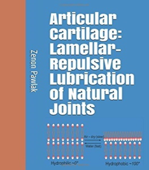 Figure 5: (A) Surface of articular cartilage under the wet (hydrophilic) and air-dry conditions (hydrophobic). Book cover “Articular Cartilage: Lamellar-Repulsive Lubrication of Natural Joints” [6]. (B) (B) Hyaluronan (A-), phospholipids (PLs) and lubricin (Lubr) in human synovial fluid (SF) in patients with healthy joints control (SF) and joint diseases with early osteoarthritis (eOA), late osteoarthritis (lOA) and rheumatoid arthritis (RA) [2, 3].