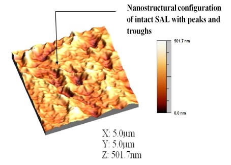 Figure 3: 3D topograpicical image atomic force microscopy of (A) normal healthy cartilage after image processing, showing the nanostructure arrangement of the surface amorphous layer with several peaks and troughs (B) delipidized cartilage after image processing, indicating the loss of the membranous overlay (surface amorphous layer) of the articular surface [(length (X) and breadth (Y) of the scanned area, and average peak height of SAL [6].