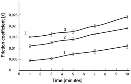 Figure 2: Friction coefficient vs. time for the (cartilage/ cartilage) pair, (curve 1) normal sample, (curve 2) with early osteoarthritis (sample partially PL depleted) and (curve 3) late osteoarthritis (sample totally PL depleted).