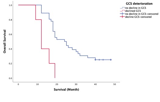 The analysis also revealed a significant impact of GCS decline at presentation on overall survival. Patients who did not experience a decline in GCS had a mean OS of 28.03 months (median: 24 months), while those with a decline had a mean OS of only 13.60 months (median: 12 months). The log-rank test produced a Chi-square value of 12.33 and a p-value of 0.000, demonstrating a highly significant difference in survival outcomes based on GCS status. This result emphasizes that maintaining neurological function at diagnosis is critical for improving survival prospects.