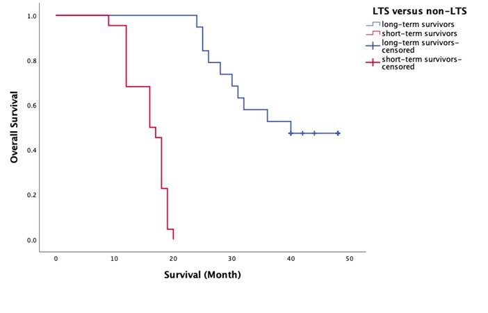 All statistical analyses were performed using SPSS version 24.0 software (IBM, Armonk, New York), with a significance threshold set at P < 0.05. Descriptive statistics for continuous variables were expressed as mean ± standard deviation, while nominal variables were reported as counts and percentages. Continuous variable means were compared using independent samples t-tests, and nominal variable proportions were analyzed using the Chi-square test or Fisher’s exact test as appropriate. The study population was categorized into long-term survivors (LTS) and short-term survivors (non-LTS) to evaluate differences between these groups.