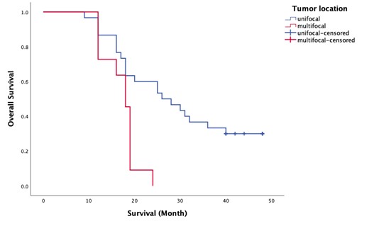 Lastly, tumor location was also found to significantly affect overall survival. Patients with unifocal tumors had a mean OS of 29.63 months (median: 26 months), while those with multifocal tumors had a mean OS of 17.09 months (median: 18 months). The log-rank test indicated a Chi-square value of 9.42 with a p-value of 0.002, confirming that unifocal tumor status is associated with better survival outcomes compared to multifocal tumors (Check out Figure 5.).
