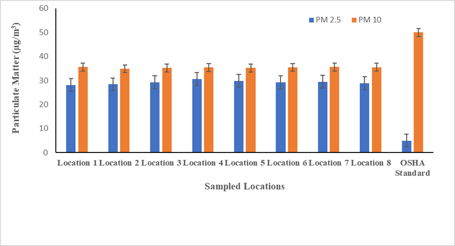 The atmospheric temperature recorded across different sampled locations within the auto-mechanic village showed mean values that were higher than OSHA standards (Fig 1). This suggests that the working environment in the area is warmer than recommended, which could contribute to worker discomfort, dehydration, and reduced productivity. The presence of heat-generating activities, vehicular emissions, and lack of shade may be responsible for these elevated temperatures. The concentration of formaldehyde (HCHO) and total volatile organic compounds (TVOCs) was measured at multiple locations but lower than the standard (fig 4). PM2.5 levels were higher than OSHA standards, whereas PM10 levels were lower as indicated in figure 2. Elevated PM2.5 concentrations are concerning because these fine particles can penetrate deep into the lungs, leading to respiratory diseases and cardiovascular complications. The high levels may be attributed to combustion engines, welding, tire burning, and unpaved road dust. Measurements of carbon dioxide (CO₂) revealed that concentrations was higher than OSHA standards (fig 3). High CO₂ levels could indicate poor ventilation and can contribute to fatigue, dizziness, and reduced cognitive function. CO2 emissions are likely due to vehicular emissions, fuel combustion, and inadequate air circulation in workspaces. The results indicate that temperature, PM2.5, and CO₂ levels in all sampled locations exceeded OSHA standards significantly. However, relative humidity, formaldehyde, TVOCs, and PM10, were generally lower than OSHA's permissible limits. The significant differences (P<0.05) suggest air pollution concerns in Samonda Auto-Mechanic Village, particularly in PM2.5 and CO₂ levels, which could pose health risks to workers and residents in the area. The various air quality parameters measured from the auto-mechanic village is presented in table 2.