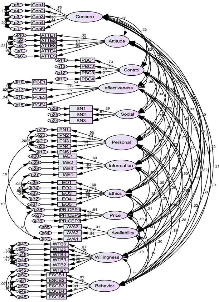 The β std regression coefficient for PBC → environmentally responsible willingness to behave is 0.11 at a significance level of 0.01. This would indicate a positive and significant path between PBC and environmentally responsible willingness to behave and support H8. This is in line with (M. Hasan, 2022; T. Nguyen, 2023). The study also found that perceived consumer effectiveness is the most influential predictor of Ethiopian consumers’ environmentally responsible willingness to behave followed by attitude and ethical obligation, environmental concern and social norms, availability of information, perceived behavioral control, and personal norms respectively. Personal norm is found as insignificant predicators.