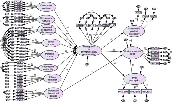 This study uses consumers’ willingness to behave and perceived behavioral control as a direct predictor of sustainable consumption behavior. The β std regression coefficient for the path perceived behavioral, and environmentally responsible willingness to behave → sustainable consumption behavior are .15, and .29 respectively at a significance level of .01, which indicates a positive and significant effect on sustainable consumption behavior, and H9 and H12 are supported. The finding is in sync with (Koszewska, 2016). From the determinate factors of sustainable consumption behavior, the outcome of the research indicated that the consumers’ willingness to behave environmentally responsible apparel products has the highest impact on sustainable consumption behavior. The result sync with (Rausch & Kopplin, 2021). PBC was found as a lower effect on the prediction of consumers' sustainable consumption behavior, agreed with other studies (Giantari et.al, 2013; Valaei et.al, 2017).