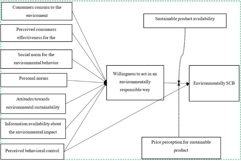 The study investigated the environmental factor of behavior using a variety of responsible behavior antecedents, including the most widely used TPB for understanding responsible consumer behavior (Rizkalla, 2018). And for the sake of increasing the accuracy of predicting the actual consumption behavior of a consumer, a model was extended by adding relevant variables see Figure 1 below. In this study, the consumers' intention was substituted by willingness, as suggested by (Abdul-Muhmin, 2007) because there are fewer environmental amenities and sustainable product options available. The model's variables were derived from previous studies and qualitative research results and adapted for the sustainable consumption context.