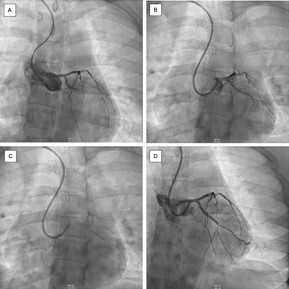 Coronary angiography with percutaneous coronary intervention of the left circumflex coronary artery. (A) Angiogram showing 100% occlusion of left circumflex coronary artery. (B) Advancement of the guidewire. (C) Positioning of the stent. (D) Post-stenting TIMI-3 flow in the culprit vessel.