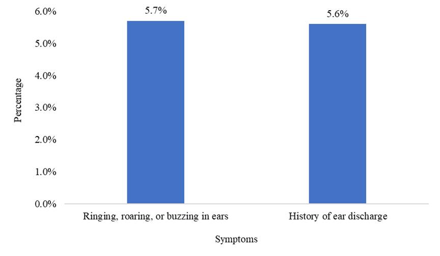 A significant association was found between a history of ear discharge and abnormal tympanic membrane status. Participants with a history of outer or middle ear discharge were 33.27 times more likely to have an abnormal tympanic membrane, supporting the notion that ear discharge often indicates perforation. 16 Research in sub-Saharan Africa has identified a connection between hearing loss and factors such as chronic ear infections, earwax accumulation, advanced HIV, and tuberculosis.18