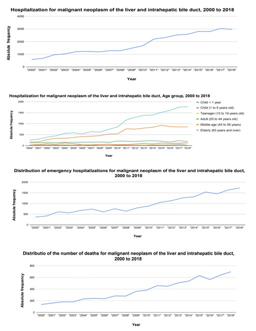 These results are in line with what the literature states about some diagnoses that constitute the ICD C22 subgroup, such as intrahepatic biliary tract carcinoma, which develops without signs and symptoms, and which only manifest in a more advanced stage of the disease when the patient is middle-aged (45 to 59) or elderly (60 years or older).17, 19-26