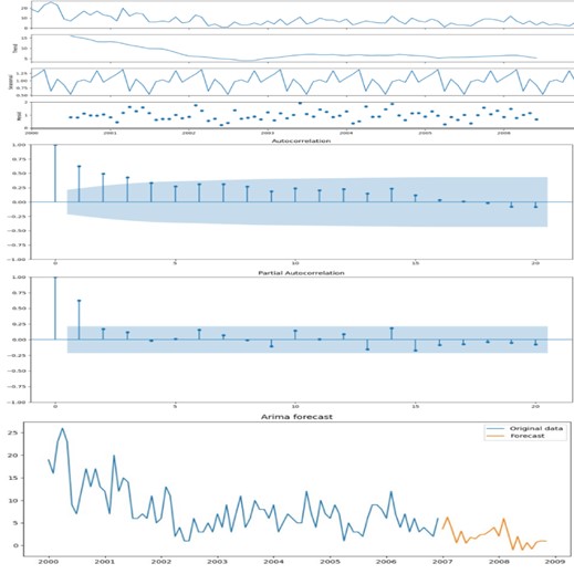 This result is consistent with the ARIMA forecasting model for the time series, which already showed an upward trend in the 2000-2006 period.