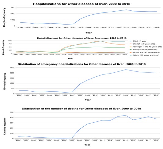 There was a significant increase of 337.34% in the number of hospitalizations of patients diagnosed with Other liver diseases between the periods 2000-2006 and 2007-2013. While in the period 2000-2006, 2769 hospitalizations were recorded, with an average of 395.57 hospitalizations, a variance of 665.95 and a standard deviation of 112.24, of which 1439 (51.96%) were urgent.