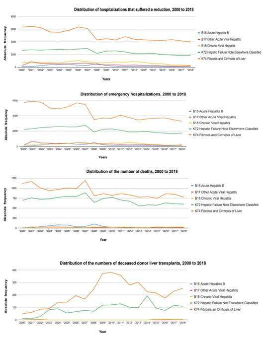 Since 2000, some diagnostic groups that characterize hepatocellular carcinoma have shown a reduction in patient hospitalizations, such as ICD 10 diagnoses: B16 - Acute Hepatitis B; B17 - Other acute viral hepatitis; B18 - Chronic viral hepatitis; K72 - Liver failure, not elsewhere classified; and K74 - Liver fibrosis and cirrhosis.