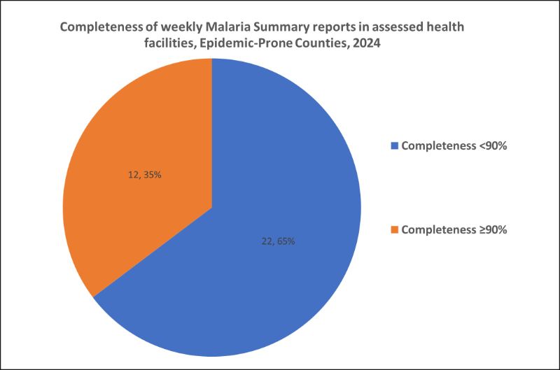 For the weekly summary reports, this study observed a relatively high rate of timely reporting (88.2%), but a low rate of completeness (35.3%). Timely but incomplete reporting weakens the surveillance system by delaying appropriate responses by authorities. About a quarter of facilities observed in our study who lacked standard weekly reporting tools relied on SMS to submit reports. SMS as a reporting medium is prone to transcription errors, missing metadata, delays in verification, and difficulty in quality checking. Recent Kenyan HMIS reporting reviews have flagged these risks, especially when SMS reporting is not supported by facility-level records or oversight. Although in the study in Nandi County by Githinji et al. (2024) completeness (77%), was assessed for monthly reports, it was higher than that observed in our study. These comparisons suggest that routine support supervision and mentorship can significantly raise both reporting timeliness and completeness of weekly surveillance reports.