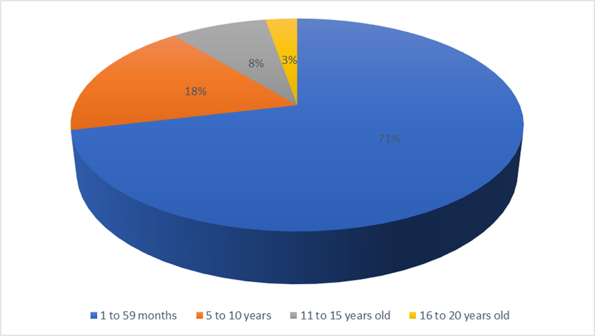 During the study period, 2,097 pediatric admissions were recorded across the five hospitals. Among these, 146 deaths occurred, corresponding to a hospital mortality rate of 7.0%. The mean age at death was 3.7 years (±2.4), with 71.2% occurring in children under five years (OR=2.4; 95% CI: 1.5–3.9; p=0.001). This distribution is shown in Figure 3, where children under five represented more than two-thirds of all deaths. The male-to-female ratio was 1.14, with no significant difference observed (p=0.959).