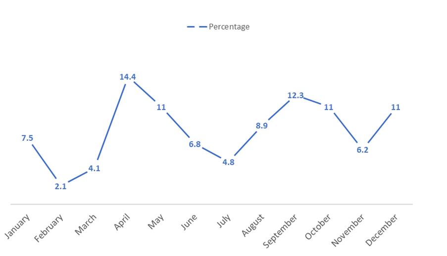 Analysis of the monthly distribution of deaths revealed three distinct seasonal peaks: April–May, September–October, and