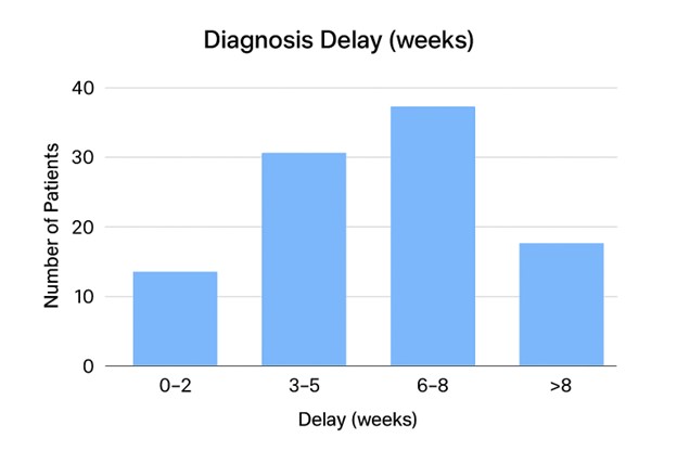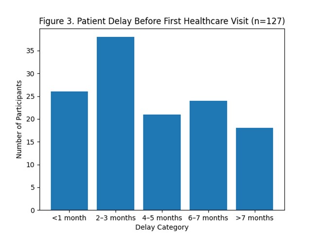 Patient delay was substantial. The highest proportion of participants (29.9%, n = 38) sought care only after 2–3 months of onset of symptoms, followed by 20.5% (n = 26) who sought care within the first month. Notably, 33.1% (n = 42) of respondents delayed for five months or longer, with 14.2% (n = 18) delaying for more than seven months.