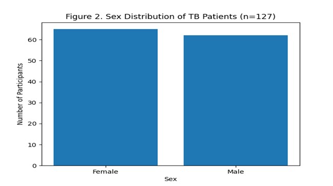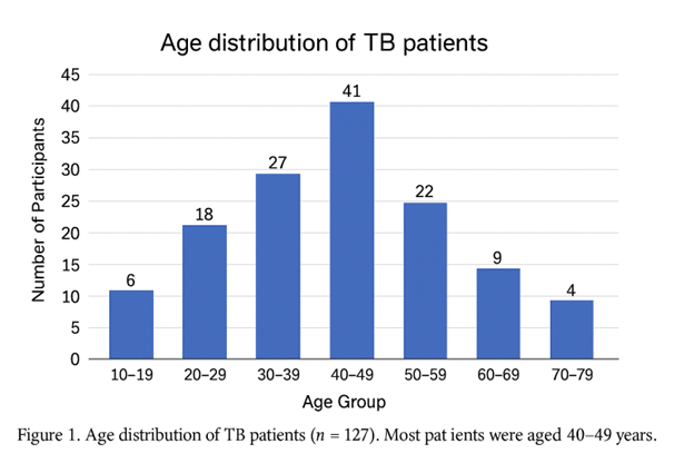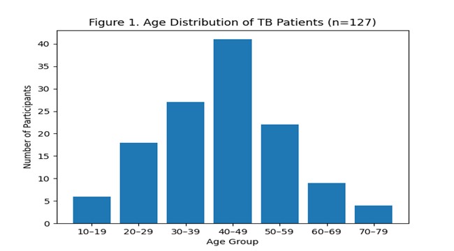 A total of 127 adults diagnosed with smear-positive pulmonary tuberculosis participated in the study. Females comprised 51.2% (n = 65), while males accounted for 48.8% (n = 62). The age distribution showed that most patients were between 40–49 years (32.3%, n = 41), followed by 30–39 years (21.3%, n = 27) and 50–59 years (17.3%, n = 22). Only 3.1% (n = 4) were aged 70–79.
