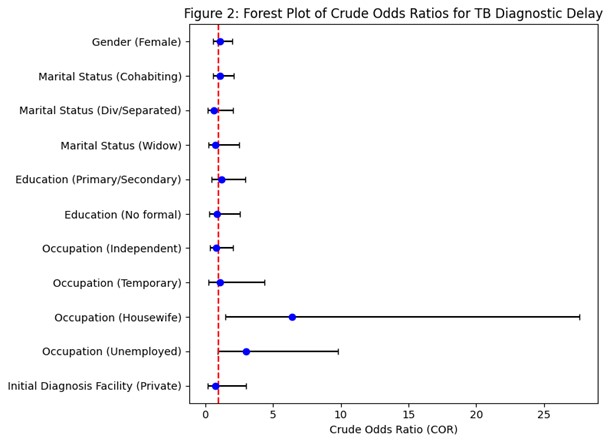 Figure 2 presents a forest plot summarizing the crude odds ratios (CORs) for all socio-demographic variables, highlighting occupations and household size as key determinants of TB diagnostic delay. This visual representation allows rapid identification of high-risk subgroups for targeted interventions.
