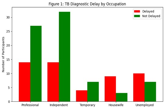 Figure 3 shows companion bar charts for categorical variables—occupation, education, household size, and initial diagnosis facility—illustrating the proportion of delayed versus timely TB diagnoses across subgroups. These charts reinforce the trends observed in Table 5 and provide a clear visual comparison of patient behaviours across socio-demographic strata.