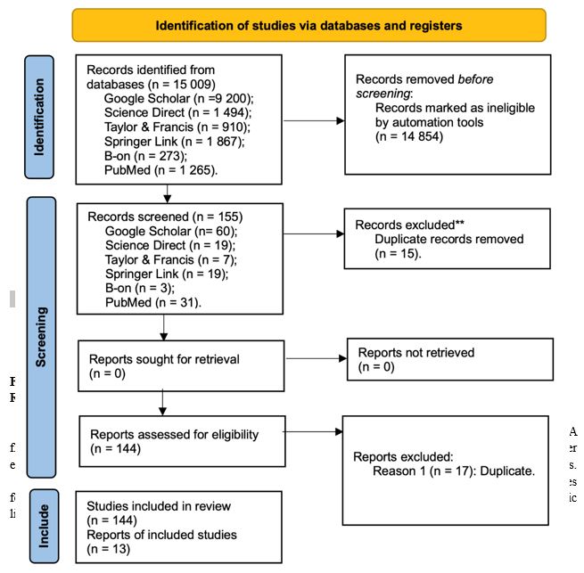 During this primary selection stage, 15 studies were duplicated and excluded. There remained 144 studies for a more detailed evaluation that met the inclusion criteria and were submitted for analysis in this systematic literature review.