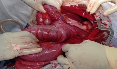 Two days later, there was a cessation of bowel movements and gas. The paraclinical assessment included an abdominal X-ray without preparation, which showed hydro-aerial levels higher than wide with peripheral topography, a hemoglobin level of 11g/dl, hyperleukocytosis at 13,000 white blood cells/mm³, and creatinine at 10mg/dl. An exploratory laparotomy was indicated and performed on November 15, 2019. The procedure was performed under general anesthesia and tracheal intubation. The incision was midline above and below the umbilicus. Surgical exploration revealed total ileocecal intussusception. Desinvagination maneuvers were difficult and impossible.