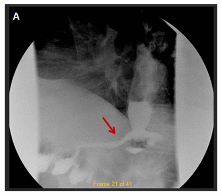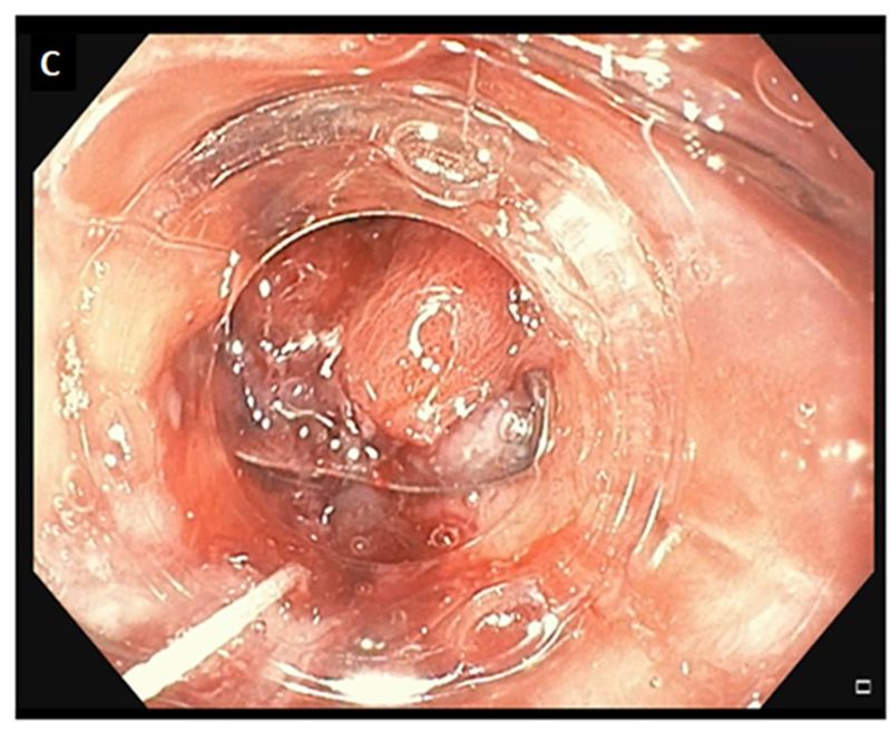 A 57-year-old male with a medical history of diabetes mellitus and morbid obesity underwent a Roux-en-Y gastric bypass surgery. The patient manifested a staple-line anastomotic leakage. After one week of conservative management, a 1.5cm persistent leakage was confirmed both radiologically (Figure A) and endoscopically (Figure B), so an endoscopic closure with over the scope clip (OTSC) using the suction method was performed (Figure C). Leakage of gastric liquids stopped after OTSC closure. No recurrence of the leakage was observed during the 12-month follow-up.