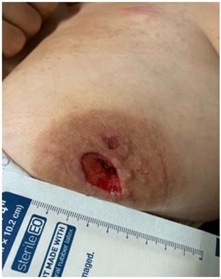 Figure 1: photo of left breast ofter nipple had completely avulsed.