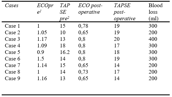 The mean tricuspid annular plane systolic excursion (TAPSE) preoperative was 14.24mmHg preoperative, ranging to 17.88mmHg post-operative (p = 0.042). Those data demonstrate an increase in the hemodynamic status of the patients after the MT. There were no major events or deaths related to the procedures. Technical success was 100% and the perioperative mortality rate was 0% (Details in Tables II and III).