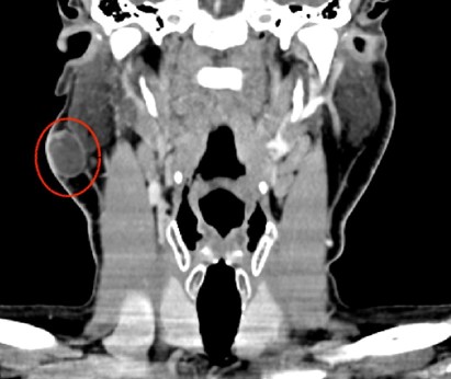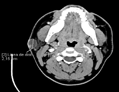 Imagen 2: axial CT scan shows a nodule on the right side at the level of the mandibular angle.