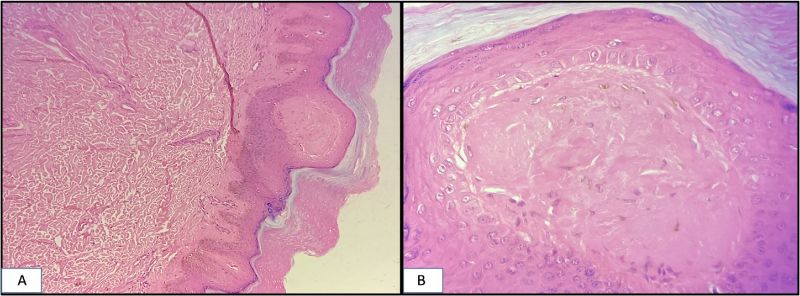 Figure 2: Epidermis showing irregular acanthosis with presence of intraepidermal acellular eosinophilic amorphous accumulation. (Haematoxylin & Eosin stain) A.100X magnification B. 400X magnification.