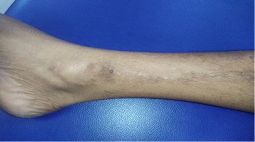 Figure 1: Local examination showing macules and papules coalescing into plaques and patches on leg.