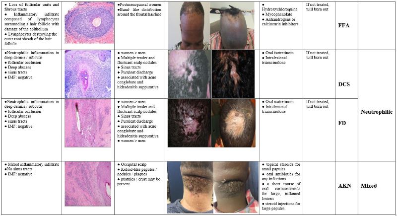 The consequences of hair loss extend beyond physical implications, impacting self-esteem, self-confidence, and leading to increased levels of anxiety and depression. Patients with scarring alopecias, experience a considerable reduction in the quality of life and high levels of distress 7,8. Primary scarring alopecia affects both women and men, most commonly adults of a wide age range and ethnicities and it can be permanent or temporary; however, it is relatively rare in children. It is neither life threatening nor painful, though there can be irritation of the skin, as well as physical problems resulting from the loss of eyelashes and eyebrows 9-11. This form of irreversible hair loss is characterized by the disappearance of visible follicular ostia within an area of alopecia and histologically by the destruction of hair follicles and their replacement with fibrotic tissue 12,13. Scarring alopecia can be classified into two categories, primary or secondary. Primary cicatricial alopecia (PCA) is very challenging in terms of classification and diagnosis, both for clinicians and pathologists. In secondary cicatricial alopecia, destruction of the hair follicle is incidental to a non-follicle-directed process or external injury, such as severe infections, burns, radiation, tumors, or traction 14. This review is confined to PCA, in which the hair follicle is the target of the destructive inflammatory process.