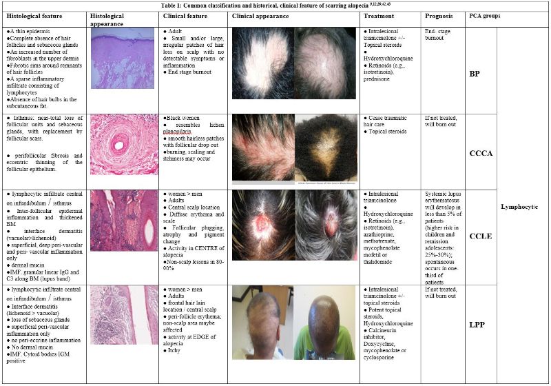Primary scarring alopecias (PSAs) are commonly attributed to irreversible damage to the hair epithelial stem cells that reside in the hair follicle 9. However, there are limited studies regarding the pathogenesis of scarring alopecia in humans 34. A multitude of factors have been implicated in triggering this group of rare disorders, which lead to the destruction of the hair follicle, replacement with scar tissue, and result in permanent hair loss. Unfortunately, PCAs are frequently difficult conditions to diagnose and treat 9. Furthermore, the pathogeneses of each of the diseases within this group remains poorly defined in many instances 35,36. Hypothesized theories are based on autoimmune origins, sebaceous glands gene expression changes, loss of immune privilege, and destruction of the bulge stem cells region 37. Considering that scalp biopsy is often non/poorly-diagnostic, a comprehensive clinical examination and accurate history taking are crucial for diagnosing primary cicatricial alopecia 38. Clues for accurate diagnosis may be obtained from factors such as age at inception, history of other associated skin diseases such as lupus, lichen planus, or other autoimmune disease, and earlier hair-care practices, along with signs and symptoms such as itching or burning of the scalp and purulent discharge 39.