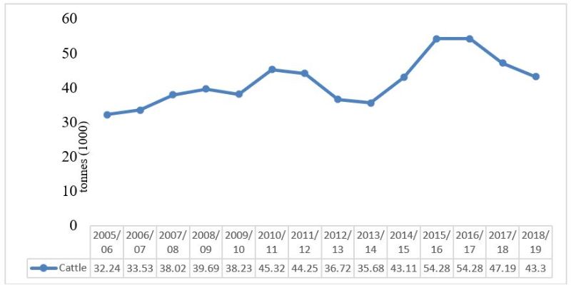 The analysis of cattle meat production in Ethiopia demonstrates consistent growth trends, with a notable 35% increase over the analyze periods. Cattle consistently maintain their position as the major contributors to the country's meat production, accounting for an average annual contribution of 41% (ranging from 35% to 47%) to the total output. This finding aligns with the research conducted by Bachewe et al. (2018), which emphasizes the significant role of cattle meat in Ethiopia's overall meat production. Similar to the overall trend in total meat production, the graph depicting cattle meat production also exhibits variations over the years (Figure 2), signifying fluctuations in the country's total meat production are largely influenced by changes in cattle-sourced meat that underscore the importance of cattle in Ethiopia's meat production sector.