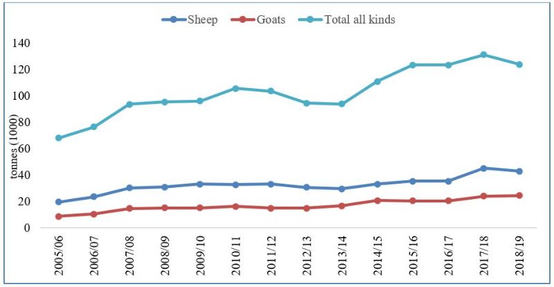 Figure 3: Meat produced from sheep and goat compared with total produced meat from all kinds.