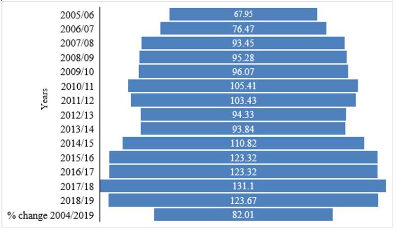 Over 15 years, meat production in Ethiopia consistently demonstrated an upward trend, with the total output increasing from 67,950 tons in 2005/06 to 123,670 tons in 2018/19, representing an impressive overall growth rate of 82.01%. However, it is important to note that the annual growth trends displayed fluctuations, with a decline in 2012/13 and 2013/14, followed by a peak in 2017/18 and a slight decrease in subsequent years (Figure 1). These findings are in line with Ritchie H. & Roser M., (2017), who also reported significant growth trends in meat production for the entire East Africa region and a 121.1% increase specifically for Ethiopia.