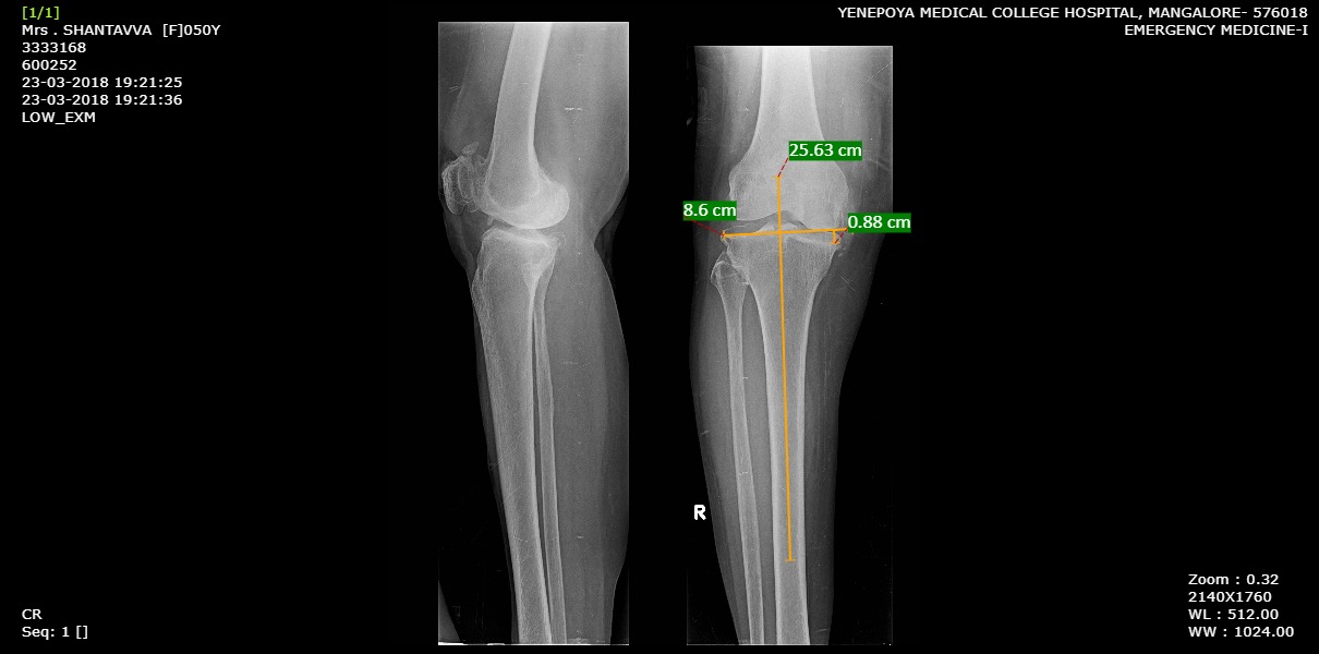 After obtaining the approval from our institutional ethics committee and obtaining informed consent from our patients, 60 patients, aged above 50 years, diagnosed with primary osteoarthritis of the knee were evaluated on OPD basis. Relevant clinical data (demographic- age, gender, place, occupation, weight, height) including chief complaint and clinical examination was obtained. BMI was calculated as a ratio of weight (in kilogram) by square value of height (in metres). Radiological assessment was done by obtaining a standard AP and Lateral view x ray of the involved knee joint. Kellgren-Lawrence (KL) grading for Osteoarthritis Knee was applied where Grade 0: No radiographic features of osteoarthritis, Grade 1: Doubtful narrowing of joint space, possible osteophytic lipping, Grade 2: Possible narrowing of joint space, definite osteophytes, Grade 3: Definite narrowing of joint space, moderate multiple osteophytes, some subchondral sclerosis, possible deformity of bone ends, Grade 4: Marked narrowing of joint space, large osteophytes, severe subchondral sclerosis, definite deformity of bone ends. Patients with KL grade ≥2 were taken into the study. The bone loss was measured radiologically using the Ahlbäck classification through the use of hospital PACS software.