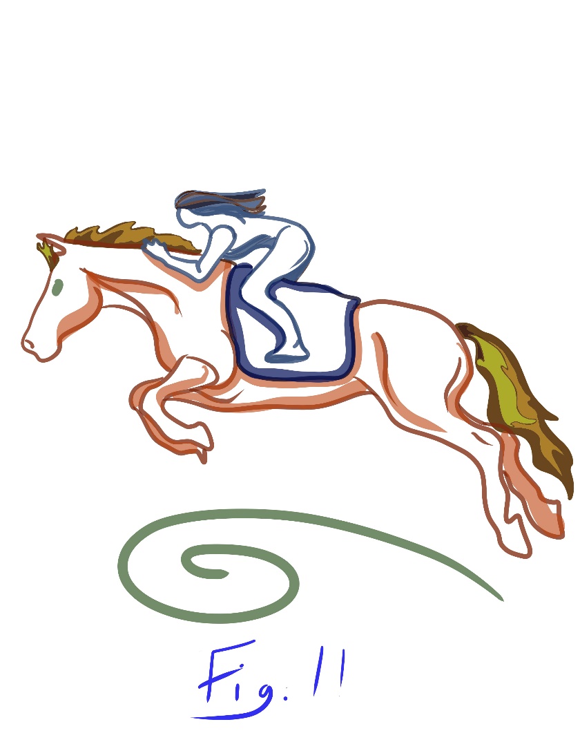 Most elite female athletes are collegiate and nulliparous. 12.5-80% of nulliparous athletes (sans childbirth life experience) suffer from urinary incontinence, clearly suggest the female athletic population at all adult ages are at higher risk for pelvic floor dysfunction (Ward, 2020; Carls, 2007). While female equestrians of all ages manage significant Newtonian forces in training and competition, experienced equestrians learn to carry their weight in the stirrups and the rider’s body is at an acute angel to the horizontal (see image #11). This relief of relieve pressure on the perineal area at the point of convergence – across the perineal area outward to the femoral neck may decrease the risk incontinence and organ decent (Alanee et al., 2009) – perhaps explains why the risk for experienced female equestrians of all ages appears concordant with the general population. This relief of relieve pressure on the perineal area at the point of convergence may explain why 38% of women trampoliners who stopped training reported a cessation of symptoms (Eliasson, 2008).