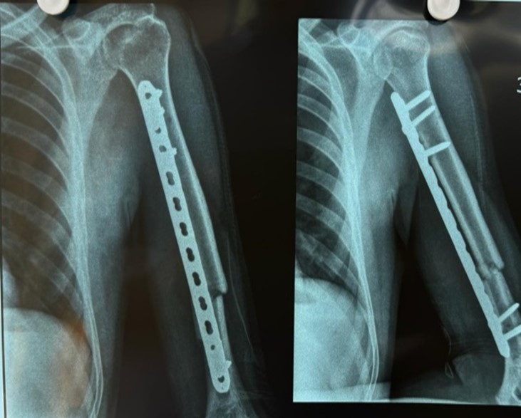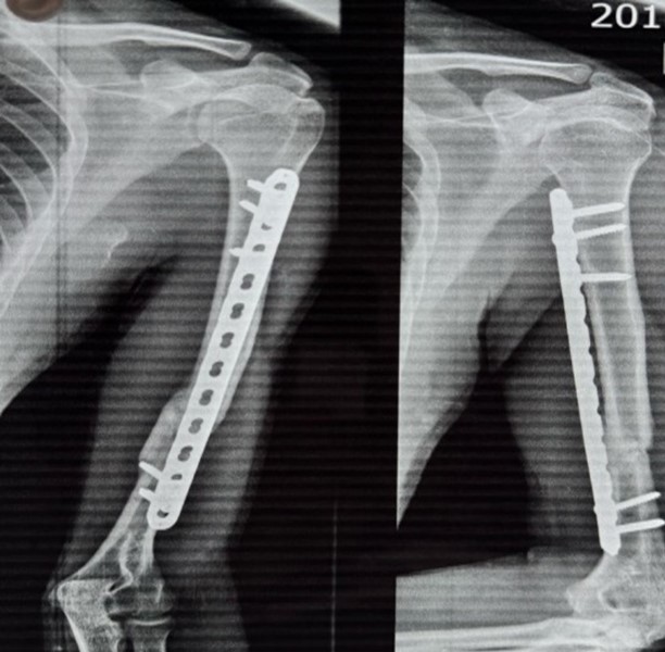 35 year old male patient suffering from closed displaced diaphyseal humerus fracture without distal neurovascular deficit. Follow up was taken at 3months post operatively and 12 months post operatively