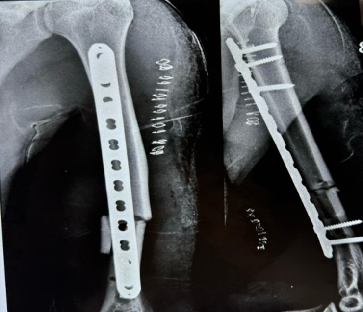 Sub-brachialis, extra-periosteal tunnel was created and a 4.5 mm DCP was passed through the incision. Angulation, length and rotation are restored using traction.