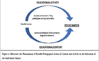Parallel pedagogical action is the law that indicates the specific way in which the person, values, attitudes and behavior develop, in that the assimilation or appropriation of the educational content happens simultaneously with the activity or experience of the learner; that the educator’s action is indirect, just as the learner’s learning is indirect. The educational action does not occur directly, nor does learning occur through linguistic means, but through the task or activity that is developed. The direct action of the teacher on the learner is the opposite of the parallel pedagogical action; thus, the educational action can be direct or indirect, or parallel, which stems from the difference between education and teaching (Figure 4). In this respect Lucien Malson affirms, “It is not the educator himself who educates, but the environment” (Vigotsky, 2012). The educator educates by organizing the environment or by directing the activities of the learner.