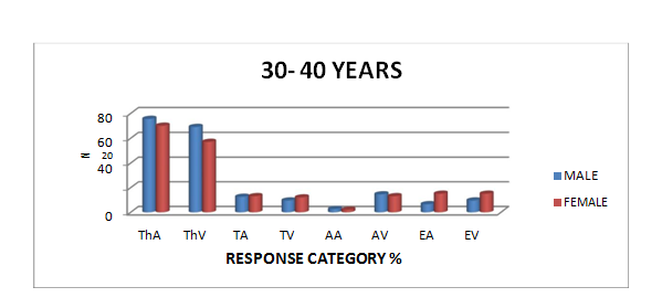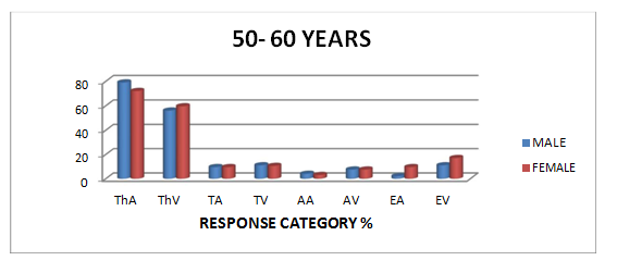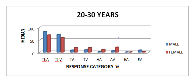 The median values of the two genders analysed through Mann- Whitney U test revealed a statistically significant difference (p<0.05) in group III. The following response categories: ThAP, ThVP, EAP, EVP with the z values: 2.496, 2.086, 3.48, 3.25, respectively, showed significant differences. The median values of the two genders analysed through Mann- Whitney U test revealed a statistically insignificant difference (p>0.05) in group IV