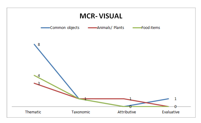 The above figure is a visual representation of the number of times the 1st MCR in the auditory modality along with the response category (Thematic, Taxonomic, Attributive, and Evaluative) each of them belong. The MCR, in line with the most dominant class of responses cited previously in the results, constitute primarily of the thematic category. (Example- /ungu:ra /- /maɖvɛ/, /gu:bɛ/- /ra:tri/, /mɛnsu- /kemmu/). This was the trend seen in all three lexical categories included in the study. The other responses class included one each in Taxonomic ( /kurtʃi/-/medʒu/) attributive (/mara/- /hasiru/), and evaluative (/manɛ/- /ʃa:nti/) in the common objects category, and one taxonomic MCR seen in animals was (/gu:bɛ/- /pakʃi/). The comparison across various lexical categories in the visual modality included the following: common household objects (10), animals/ plants (5) and food items (5).