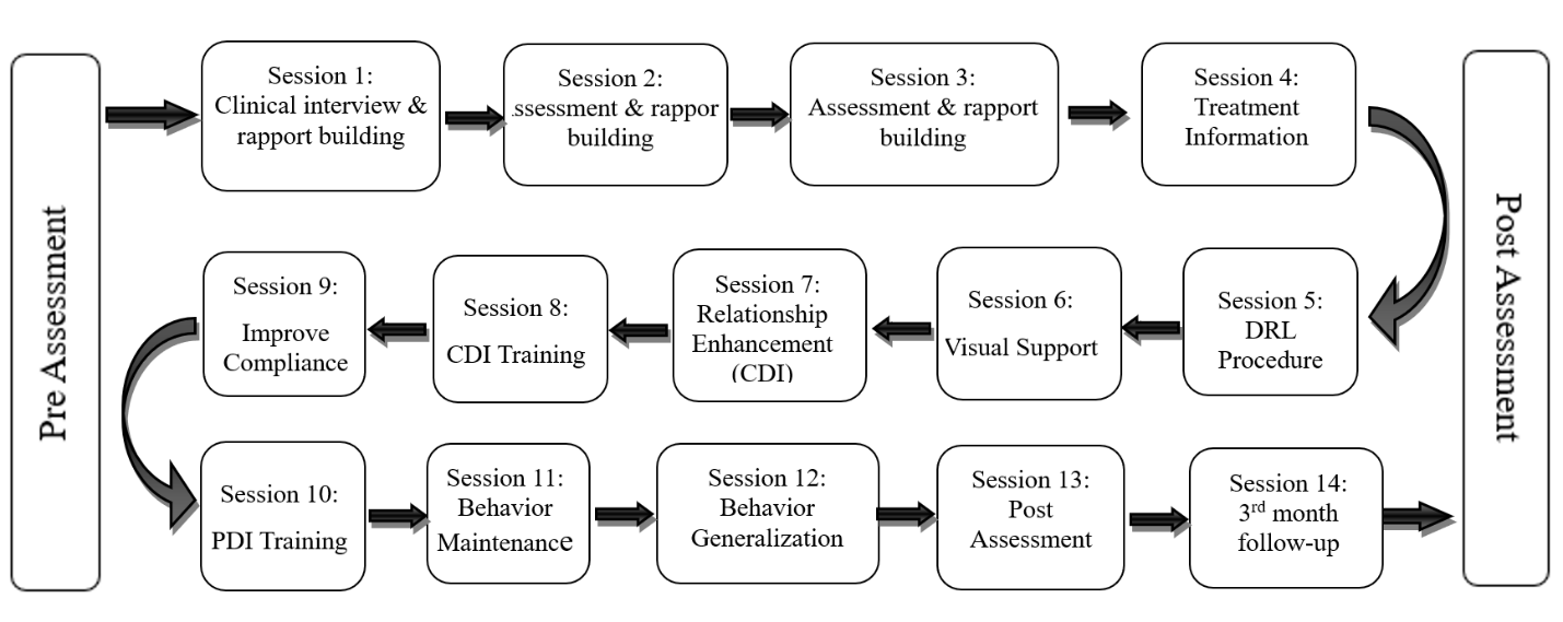 This flowchart outlines the entire clinical consultation process starting with Pre-Assessment, followed by 14 sessions. It begins with detailed interview intake, psychological assessment and treatment information including DRL procedures and visual supports. Relationship enhancement (CDI) and compliance strategies (PDI) was introduced, followed by coaching, behavior maintenance, and generalization. The process concludes with a post-assessment to evaluate outcomes and followed by a 3 months follow-up to see either the outcome measures during the post-assessment phase remain stable.
