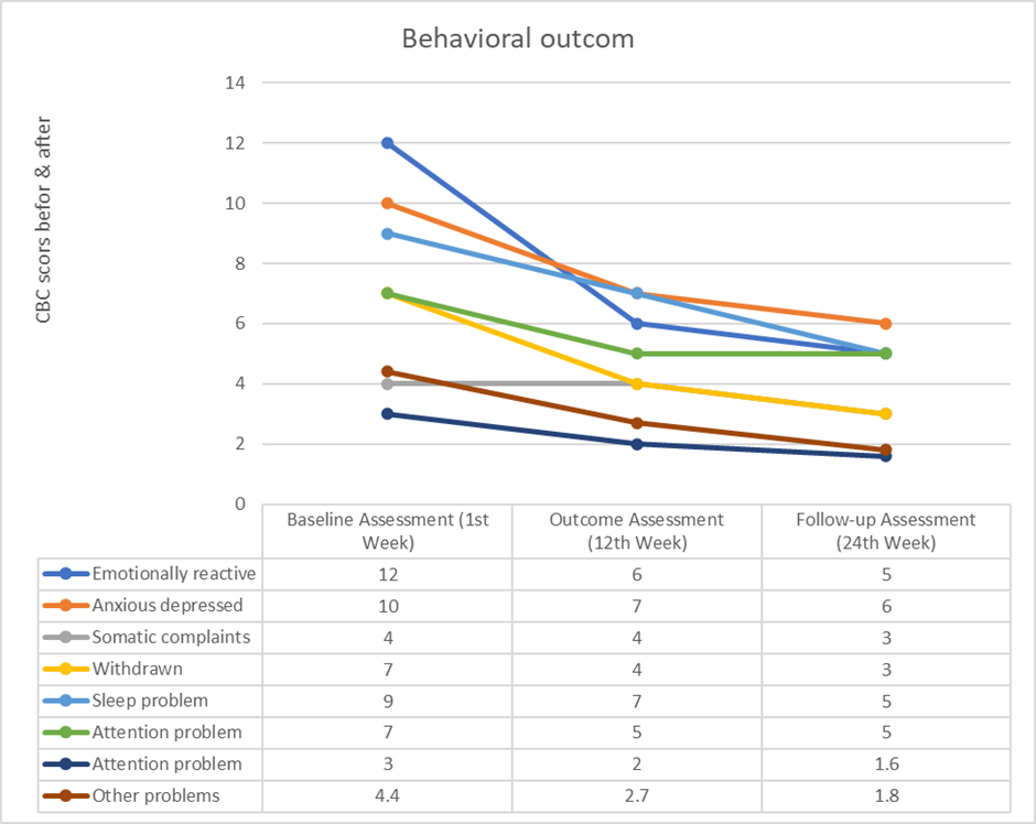 In the pre-assessment assessment, the intensity of the problems was significantly higher before initiation of treatment (see CBCL pre, post and follow-up assessment table). However, parent ratings on the CBCL decreased over the course of treatment. A 3-month post-assessment and 3-month follow-up assessment, Mother’s ratings on CBCL were significantly shows emotional and behavioral improvements.